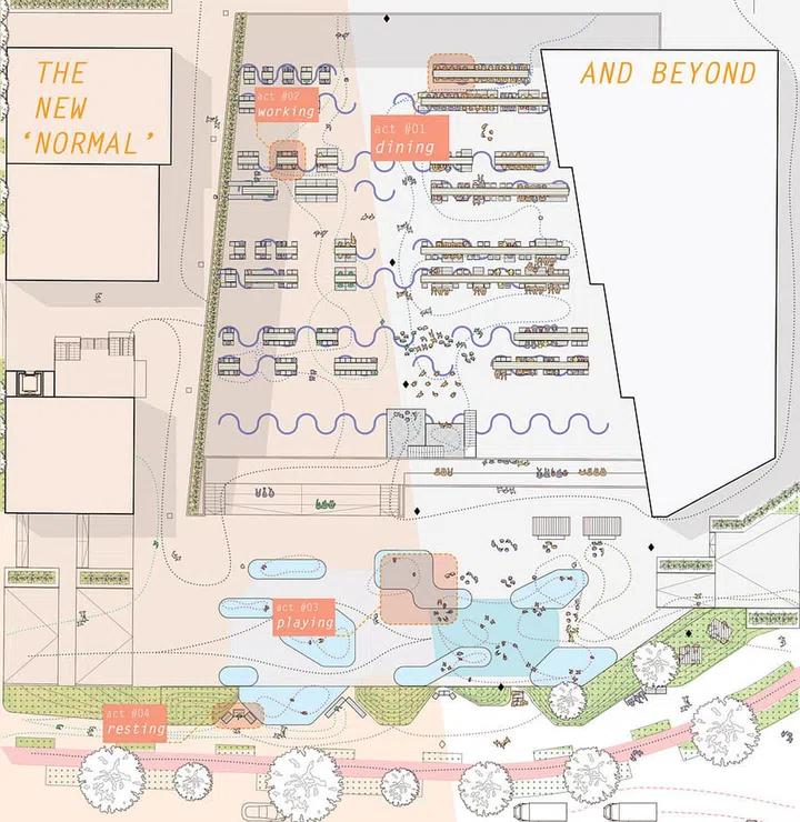 To-Gather, Apart is a floor plan design that uses mural and 2x2m grid to gently promote a safe distancing circulation.