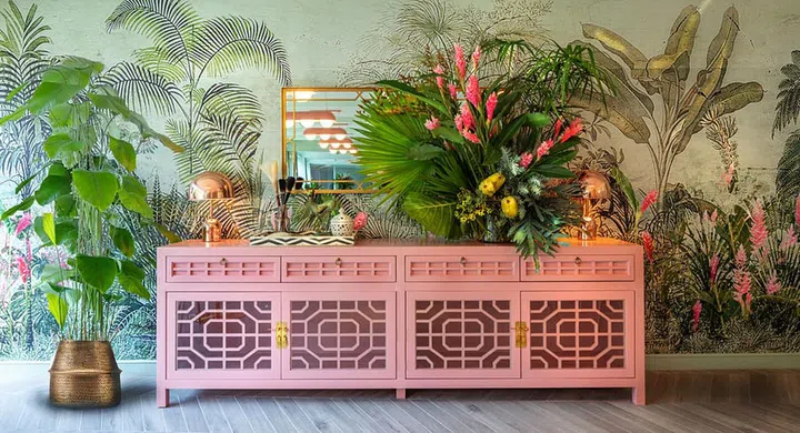 The greenery starts from the entrance, where specially commissioned wallpaper by Australian fabric designer Kerrie Brown - featuring tropical plants including the ginger flower - takes centrestage behind the reception table.