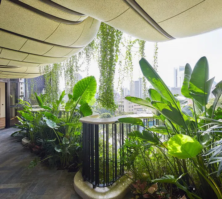 The layout of the apartment also encourages cross ventilation, doing away with the need for air conditioning. Each apartment features a variety of plants, a mix of those with large showy leaves and others that drape over the balconies.