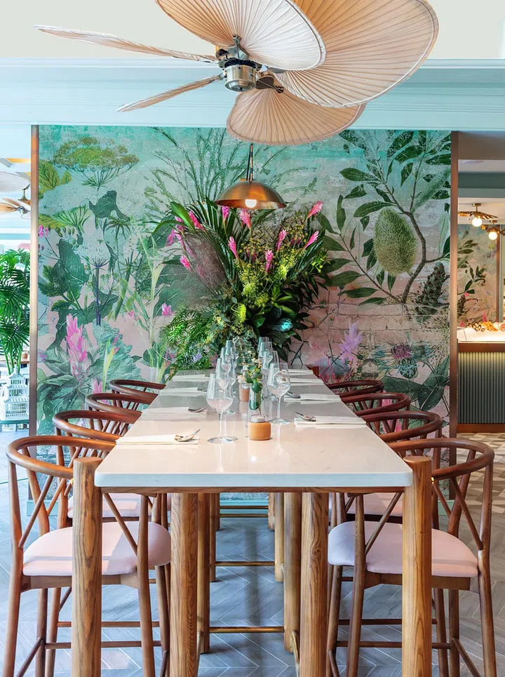 There's more of that floral wallpaper in a private dining room. Emma explains that wallpaper creates the effect of being in a tropical garden without too much fuss. She says that had she created a live green wall, that would require high maintenance and regularly replacing the plants. But of course there are pots of live floral arrangements to jazz up the space.