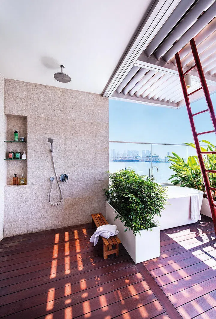 Another rooftop shower with a view, the lourves and plants create a private sanctuary for the homeowners!