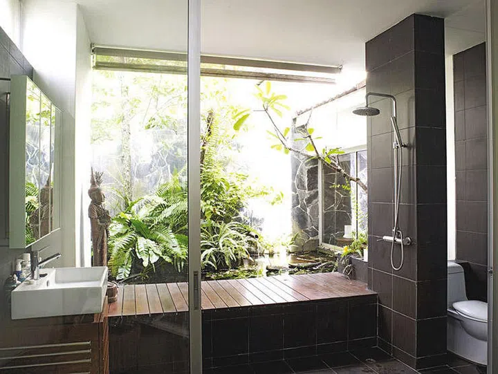 An open-concept bathroom gives you the luxury of enjoying greenery and the feel of outdoors! Just like staying in a resort!