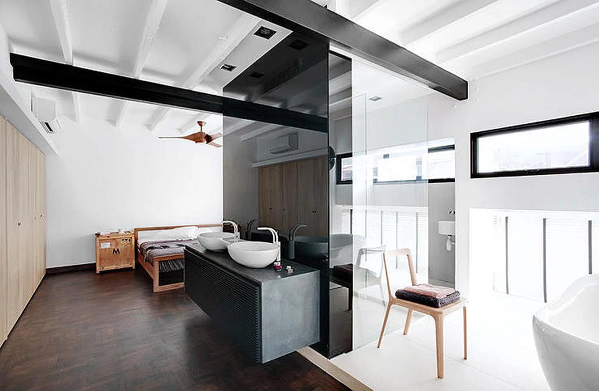 Much like hotel rooms, the bathroom and bedroom is separated by glass. We love that the shower area is not confined to a stall. Spacious!