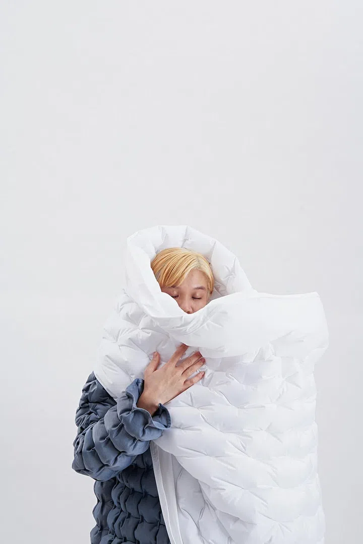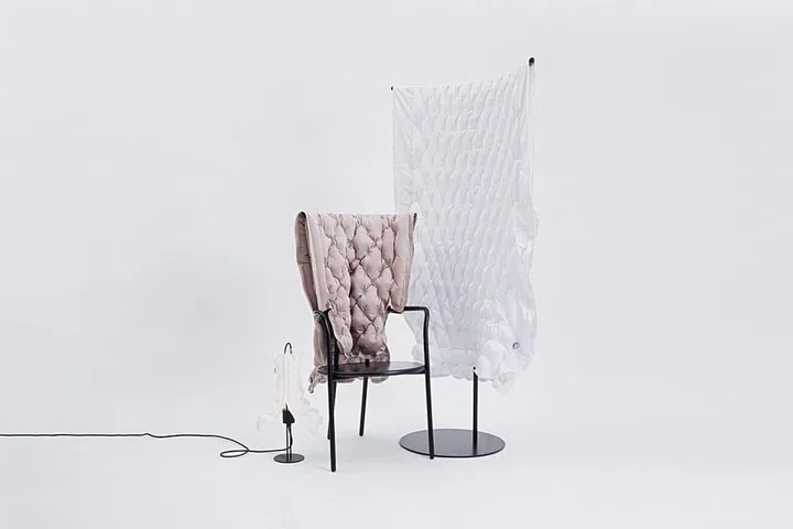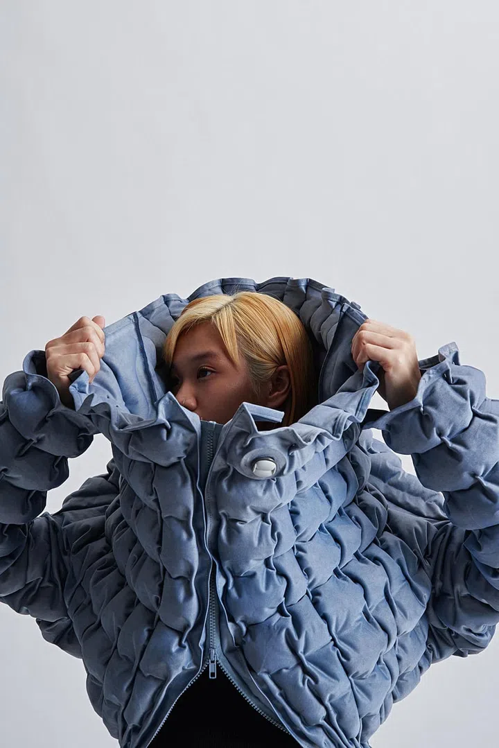 Industrial designer Sheryl Teng's explores the relationship between materials, people and objects. Her project, titled the Looft Collection, investigates air, an abundant yet intangible source, as a supporting design element made visible through pneumatic textiles. The collection comprises wearable apparels and soft furnishings, which she dubs "clothing for people, furniture and space."