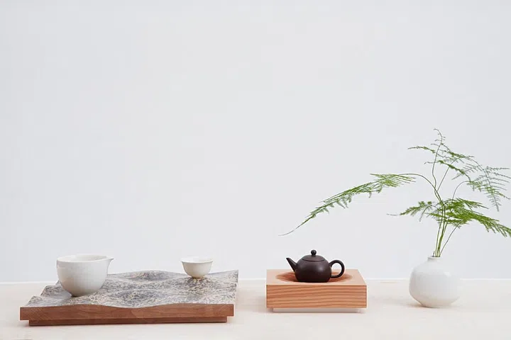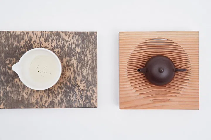 The Grained Tea Boat, for example, was crafted by eroding hemlock wood. The wood's distinct variations in hardness yielded a sculpted surface as its softer wood rings were abraded. A tribute to traditional Chinese painting, her Inked Tray turns the discolouration once perceived as imperfection into a design feature.