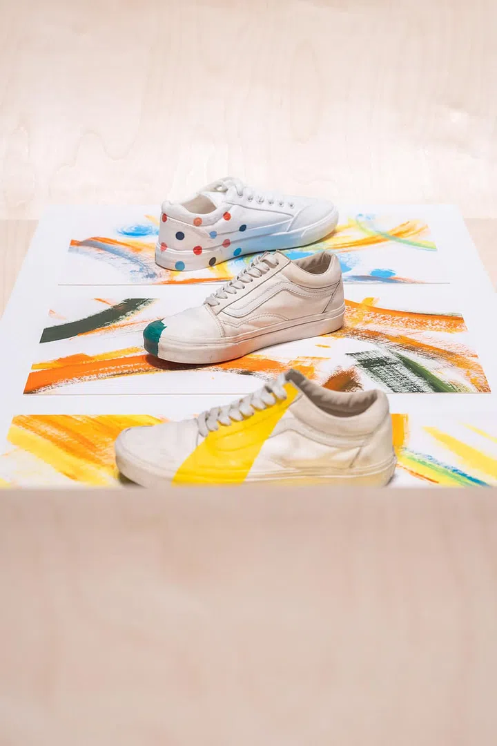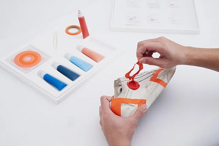 The kit comprises tubs of liquid rubber paint and pre-cut stencils. The paint hardens upon contact with air, forming a rubber surface that seals hole in canvas shoes, repairing them and remaking them anew.