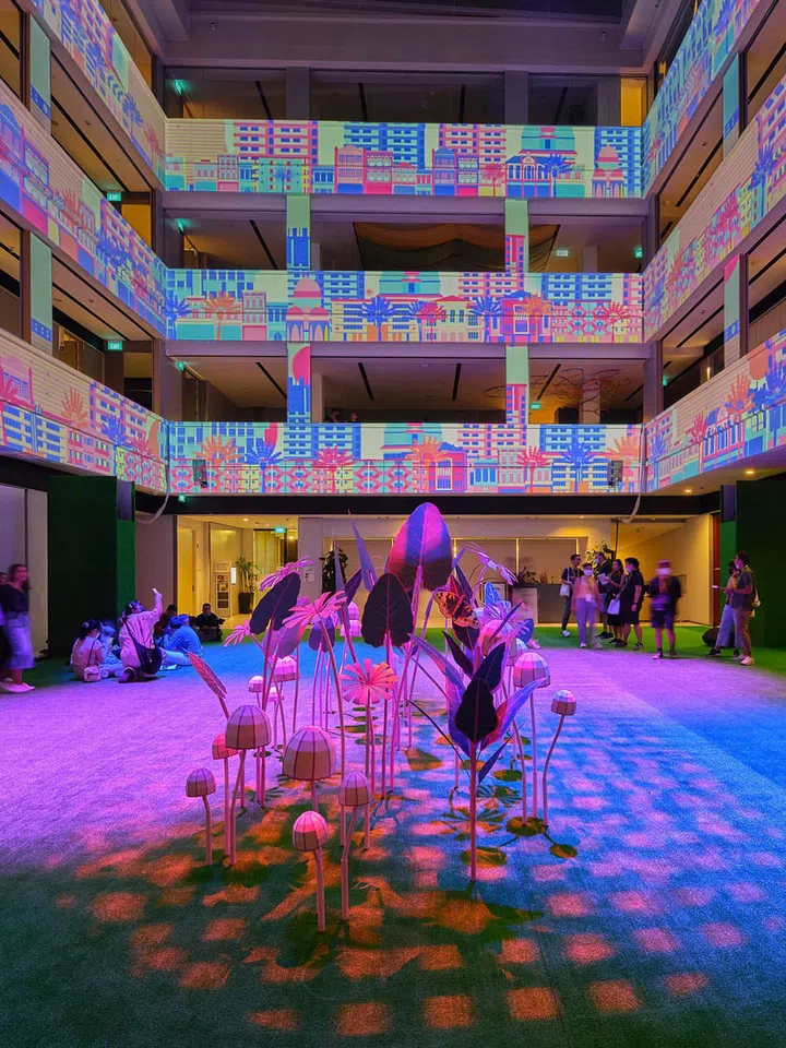 The central atrium, lined with thick artificial turf that you're welcome to sit on, is populated with colourful paper plants created by Papersynthesis based in local apparel brand Binary Style's illustrations. Aux Media's light projection, also animating Binary Style's characters, turns the surrounding walls into a living digital garden.