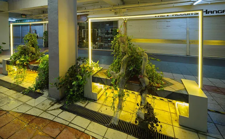 Art installation NOCTURNE: Conversations with Waterloo by Nhawfal Juma'at, in the ground floor, in the meantime, presents two sculptures captured in a transient moment when a conversation is midway.
