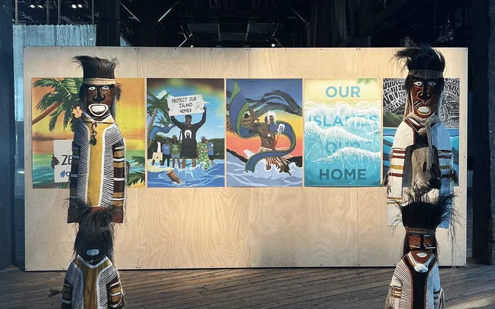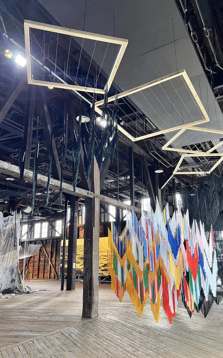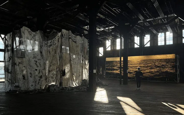 Meanwhile at Pier 2/3, which overlooks the waters of Sydney Harbour, several works benefit from the gorgeous vista. Cuban artist Yuan Capote has a stunning wall work that looks like a gold-and-black painting of the sea, though it is actually made from gold leaf and fish hooks. Finnish artist Outi Pieski drew from Sami craft traditions for her beautiful thread tapestries. The Torres Strait 8, which took the Australian government to the Human Rights Committee of the United Nations over its inaction on climate change, created an installation out of its protest material.
