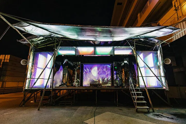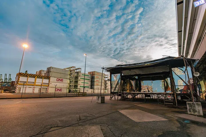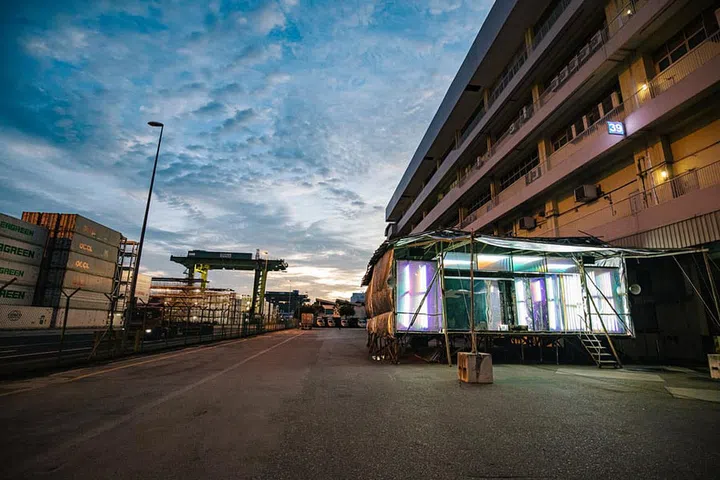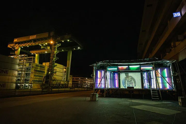 At daytime, the installation stands inconspicuously in the container seaport, while at dusk, it comes alive, activating the space with light, sound and film
