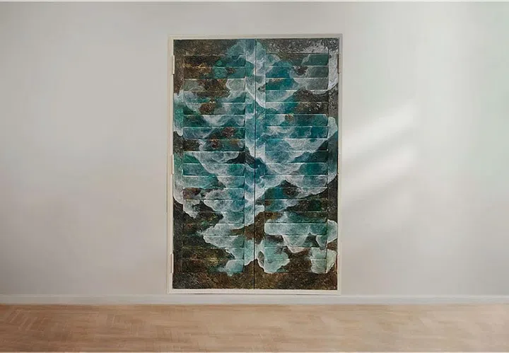 Painted on wood shutters, Recalled Siargao Seascape depicts the beauty of waves breaking on rocks.