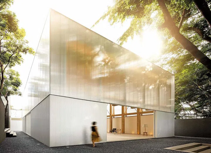 MiCasa Vol. C, a flexible pavilion for a furniture store, is built with a timber structure enveloped by translucent polycarbonate sheets in the upper half and white metal panels below, bringing light and nature inside.