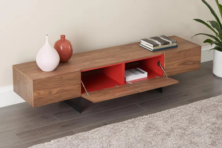 Boasting a slim silhouette raised on ultra-sleek legs, the Nigel TV Console opens up to reveal storage space and an unexpected pop of colour.