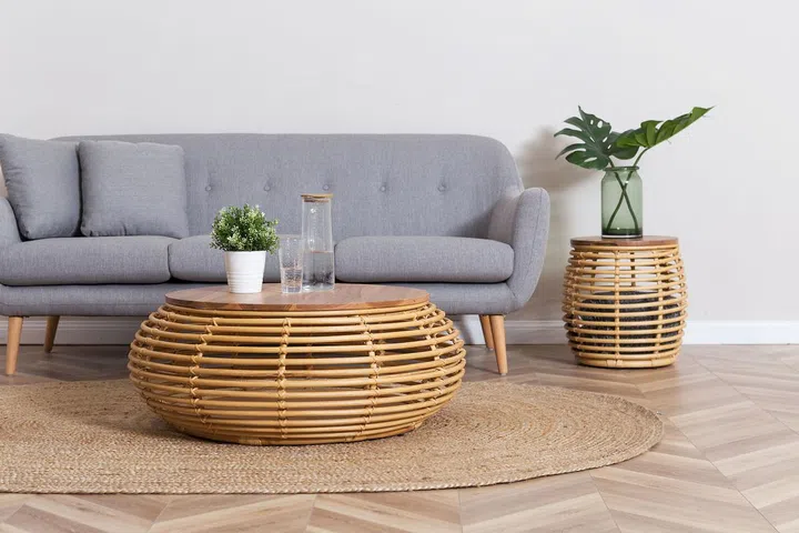 The teak table tops of the Mico Coffee Table & Side Table can be removed to reveal storage while the rattan design exudes a rustic chic vibe.