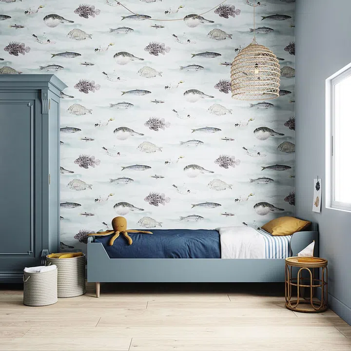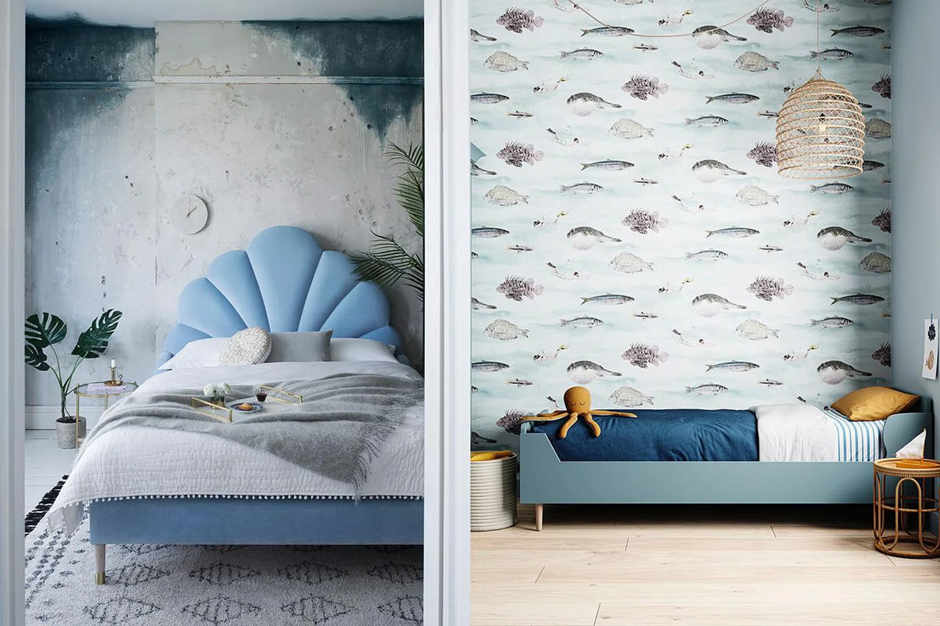 “Throw in accent pieces of complementary ochre or coral to increase the visual interest in a predominantly powder blue room, suggest Liangyuan, as seen in this bedroom dressed in ocean theme featuring Fish Classic Wallpaper by designer Sian Zeng for Limelace, which pairs powder blue with teal and ocher.
