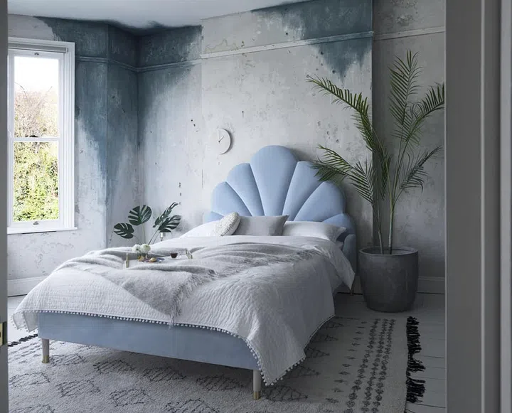 In interior design, powder blue goes best with neutrals like white, beige, greige and grey shades. Layering powder blue with other, more intense and saturated blues can have a calming and restful effect as seen in this bedroom furnished with Ariel Upholstered Bed by British brand Sweetpea & Willow, which pairs powder blue with indigo and white that creates a feminine touch.