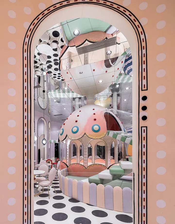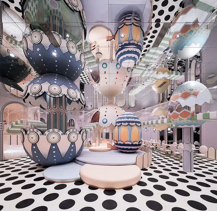 In the restaurant, fragmented pink and blue eggshells placed on the floor— which has black dots—are reflected in the mirrored ceiling. Green and white stairs add another series of colours.