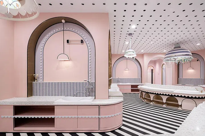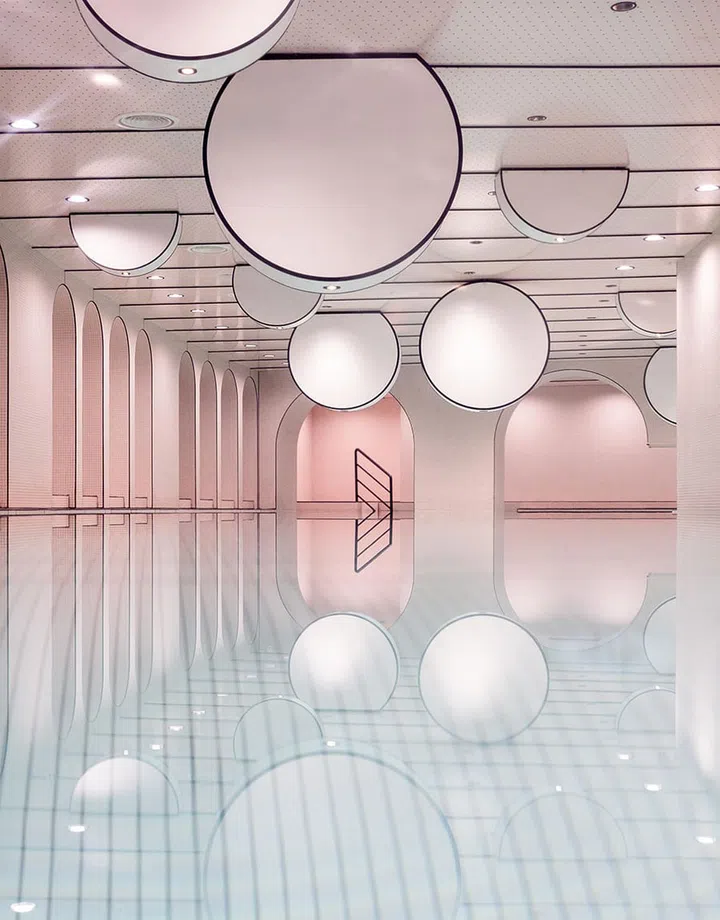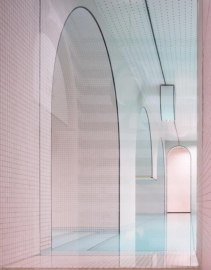 With its series of arches, pastel colours and droplet ceiling lamps, the swimming pool area invites guests to discover a magical universe characterised by the softness of the water and the entirety of the decor.