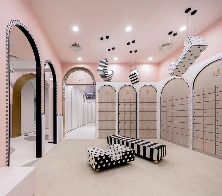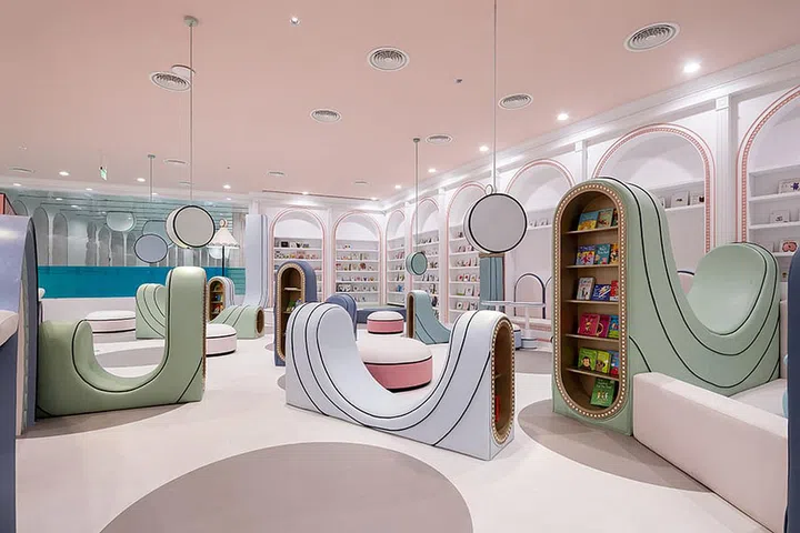 Following the shoe area, the relaxing and comfortable reading room features round lampshades and wave-shaped sofas with integrated bookshelves to