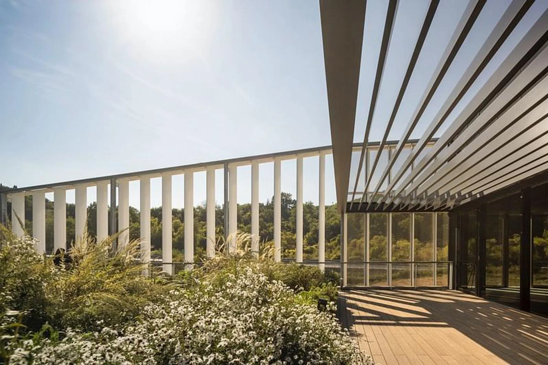 There’s more to the complex than just looks. As part of the company’s commitment to social and environmental responsibility, the buildings in the area have been designed to minimise the impact of industrial activities by reducing energy use and treating pollutants. These include the manufacturing plant, which uses a photovoltaic system and solar panels. The façade is also treated with Airlite paint, which has air-purifying properties. A system of rainwater collection helps to gather water for the gardens.
