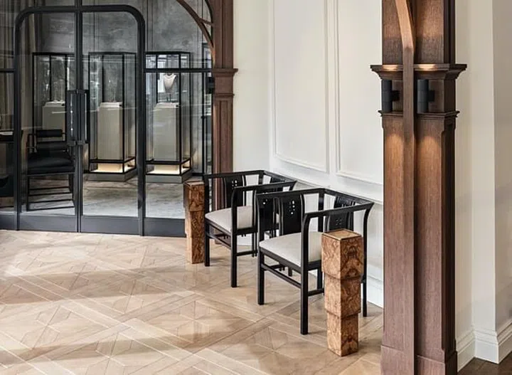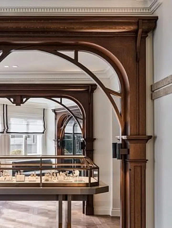 The main area of the showroom features ornate arches with sinewy timber parts that beautifully emphasise its size while denoting different zones. Striking marquetry flooring completes the tribute to its art deco heritage.