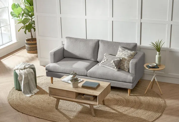 The classic light grey and brown hues of pieces like the Tana sofa, Zane side table and Miles coffee table create a calm backdrop for a soothing and welcoming space. For added texture and tactility, throw in accents such as patterned cushions or the Marc jute oval rug.