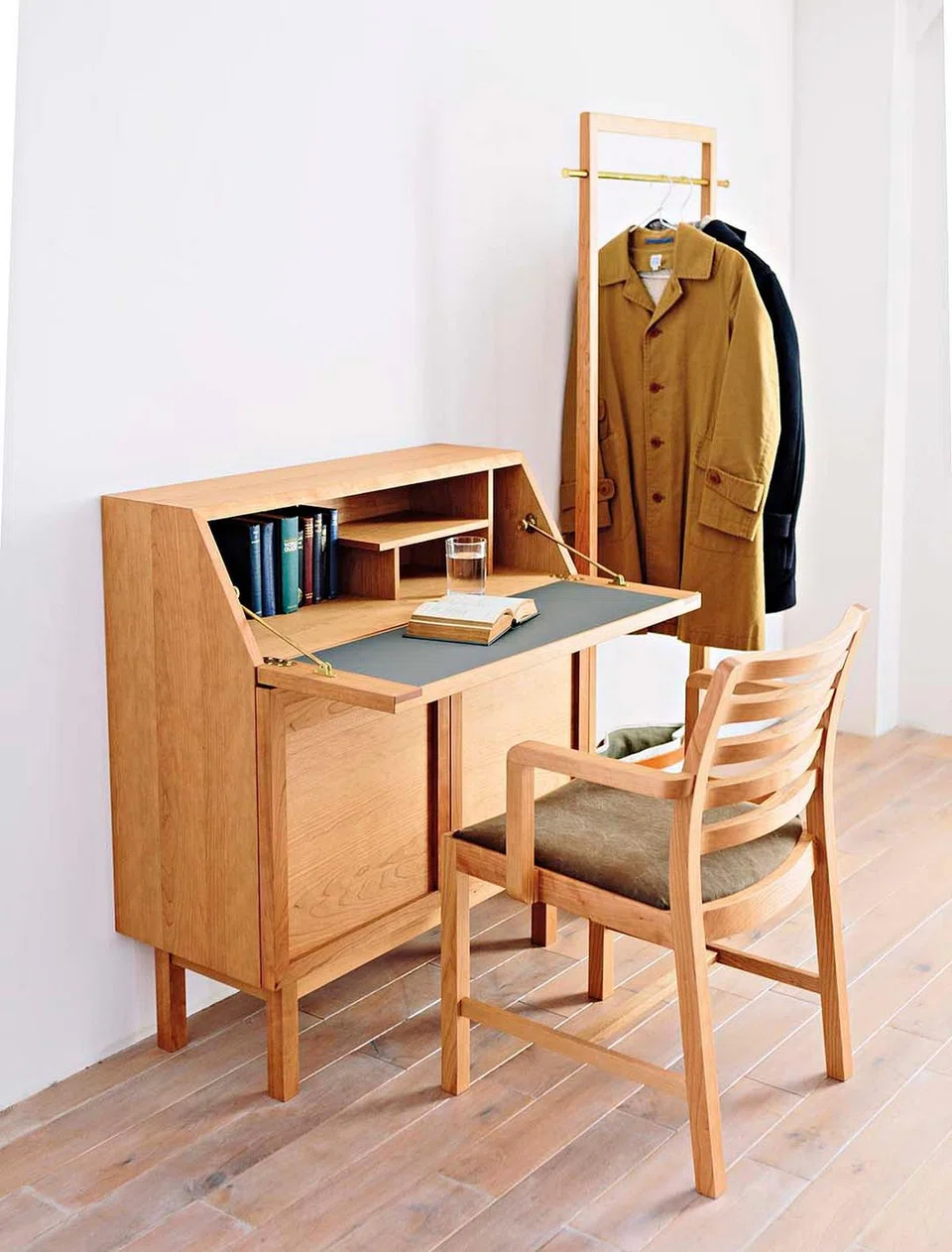 Handcrafted in Japan, the mid-century modern style Cornice writing bureau has cabinet space and a desk for reading or writing that can be stowed away when it’s not used. This gorgeous desk is ideal for compact study nooks.