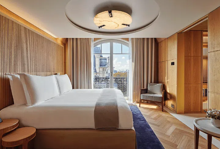 The contemporary guestrooms feature Art Deco-style furniture pieces designed by Jean-Michel and manufactured exclusively by Poltrona Frau for the hotel while the 700-sqare-metre Akasha spa with six treatment cabins, gym and hair salon bathed in natural light showcases a 17-metre-long pool surrounded by marble walls and floors, porthole-shaped decorations, Lalique vases and works by haute couture textile artist duo, Céline Alexandre.
