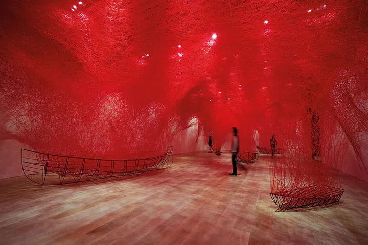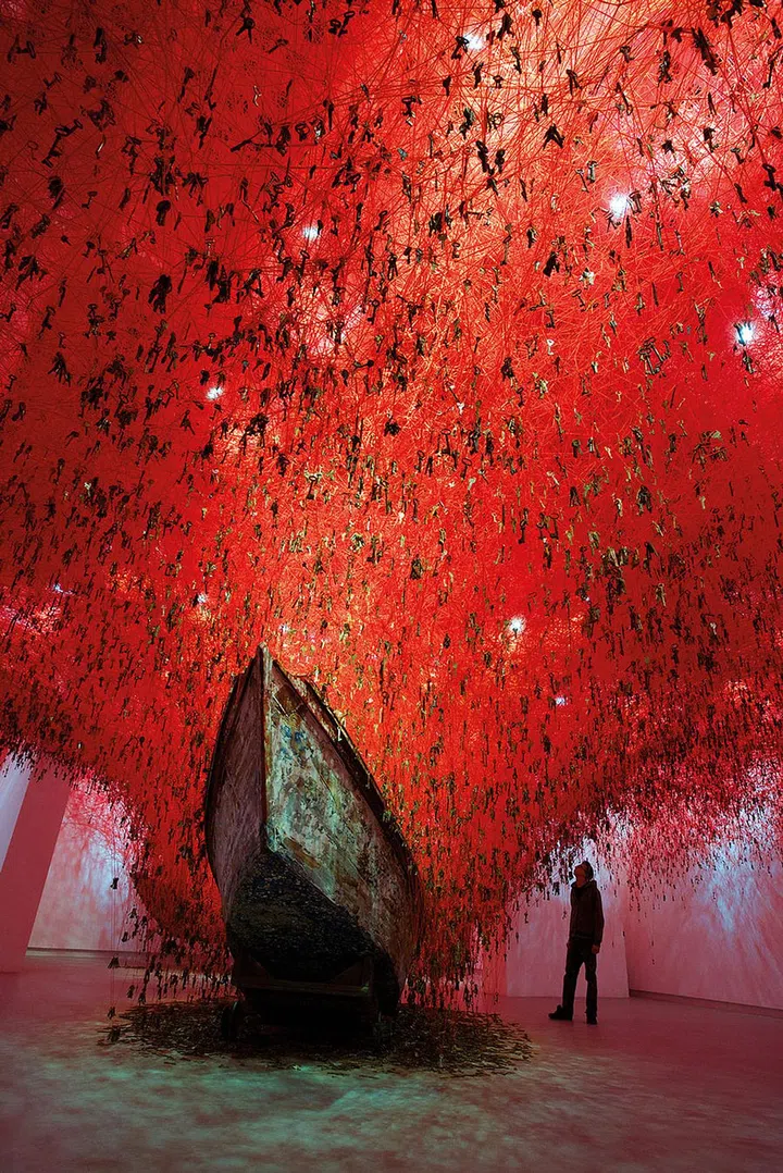 Installation The Key In The Hand (2015) at the Japan Pavilion at Venice Biennale featured old keys, wooden boats and red wool.