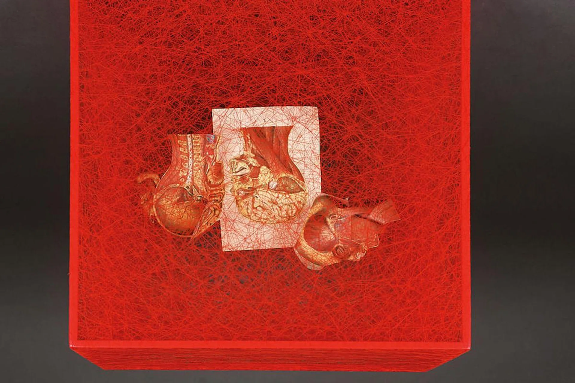 In Out of My Body, an installation expressing her connection with her body, Chiharu’s feet stand beneath net-like suspensions of red leather, creating a whirlwind of energy where her body once was. Her intriguing cubes containing clothing, a skull and anatomy books dangle amidst layers of knotted string, while a maze of threads appears to dress the canvases in “skin”.