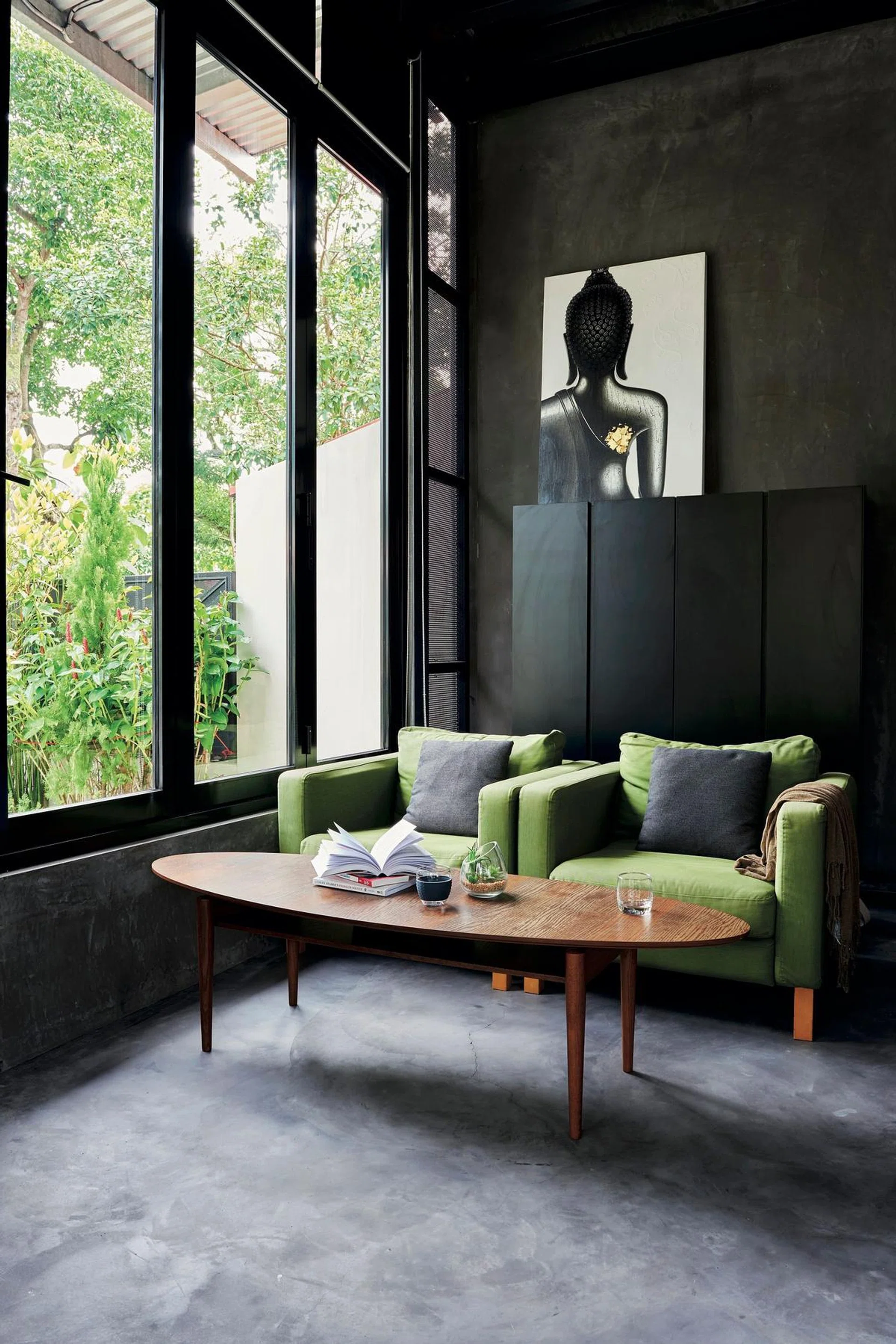 Large windows let in both natural sunlight and a glimpse of the greenery outside.