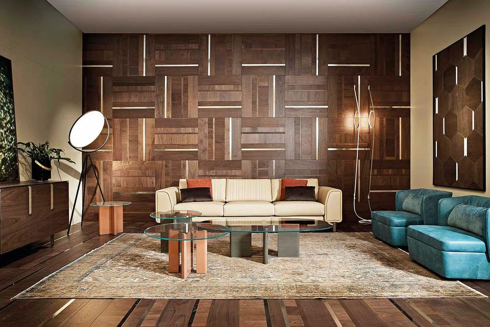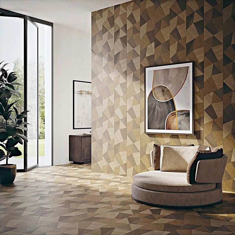 Accentuate the look of a room with interesting patterns and different wood hues by using engineered wood cladding.