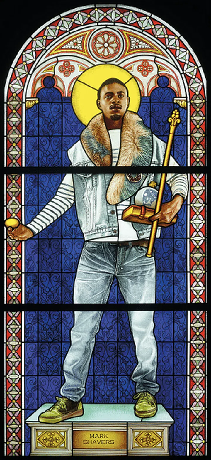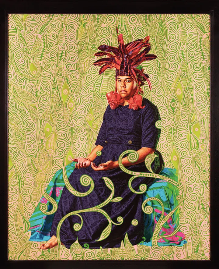 His instantly recognisable subjects might be crossing the Swiss Alps on horseback in a nod to Jacques-Louis David’s equestrian portrait of Napoleon Bonaparte or seen as a haloed saint set against a stained glass window in place of Jean- Auguste-Dominique Ingres’ portrait of the Holy Roman Empress in his investigations of religious iconography. Each body glows, permitting audiences to witness a state of grace for people rarely viewed in that way. They contrast with his unique backdrops of heavily ornamented patterns of flowers, leaves and vines representing the landscape, which are based on Victorian wallpaper, Baroque textiles or Renaissance tapestries.