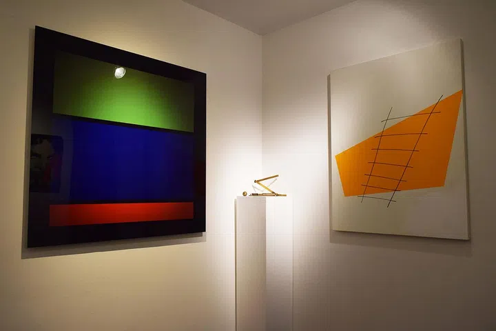 One of Jan Larsen's works, Synchrony 41 - Star Cluster 4, spotlit on the table.