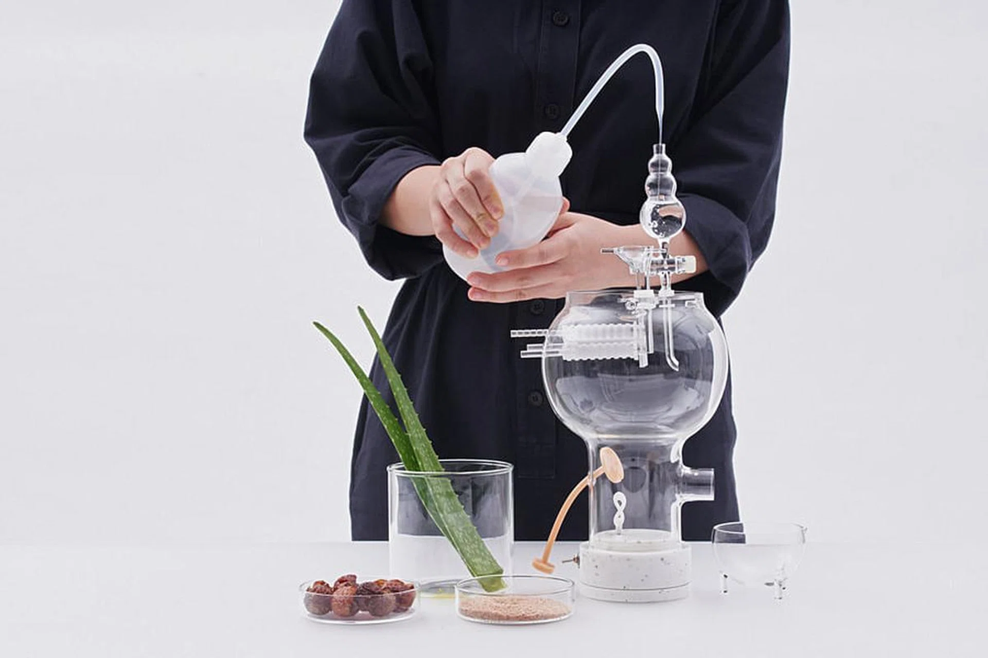 The idea is to create a mini-factory of sorts with glass parts designed to process specific ingredients. This apparatus processes soapnut powder, water and aloe vera. I was inspired by how a press machine extracts the juice from sugar cane and used the same principle for the glass parts to extract the liquid from aloe vera for the soap. Some parts were made in the Netherlands while others were done here by a local company called UFO Labglass.