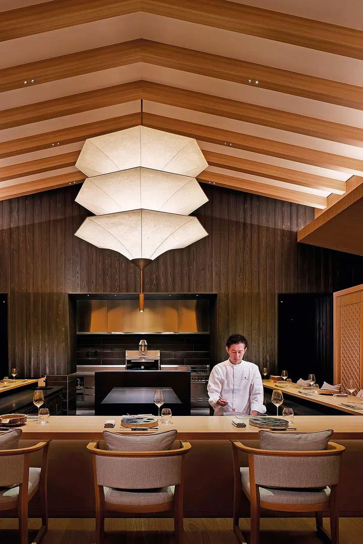 Echoing the lobby’s aesthetic, the pavilion features screens with bamboo weave patterns and a live kitchen counter with a shou sugi ban – charred treated wood with a distinct black finish – backdrop.