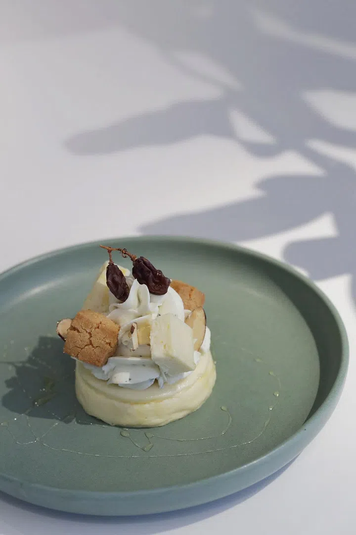 The cheese course of a dessert meal at Kki is a sweet-savoury creation featuring cream cheese and Cambozola, a mild, “entry-level” blue cheese, as Delphine calls it. Figs, prunes and apricots – the dried fruit that might adorn a cheese plate – are soaked in rum for this cake, which also features kinako cookie cubes.