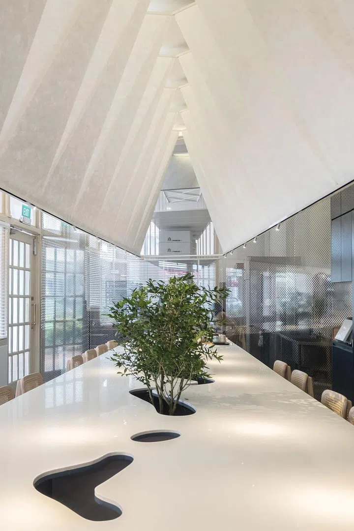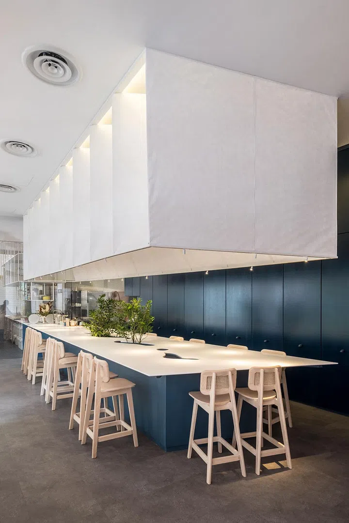 The highlight, of course, is the communal table that seats about a dozen diners. Its trapezoidal shape was derived directly from the shape of the space while its design concept is adapted from the long communal tables in London’s 17th-century coffeehouses that encouraged sociability.
