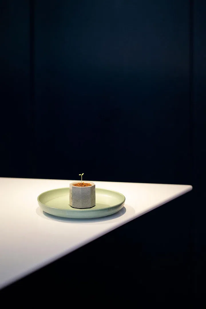 One of Kki Sweets' most popular items in the menu is simply named J after the couple’s friend James, who bonded with Kenneth because they both made concrete planters for a spell. The edible planter is made with black sesame mousse. It is filled with yuzu cremeux, its brightness tempered with white chocolate-matcha rice puffs and kinako-chocolate streusel.