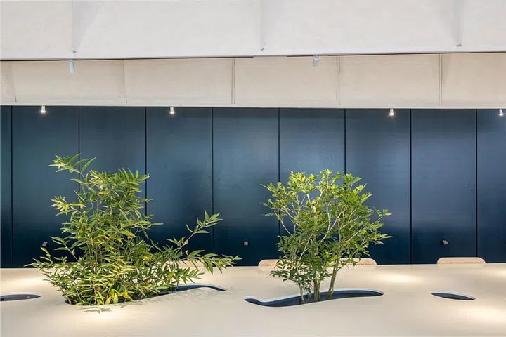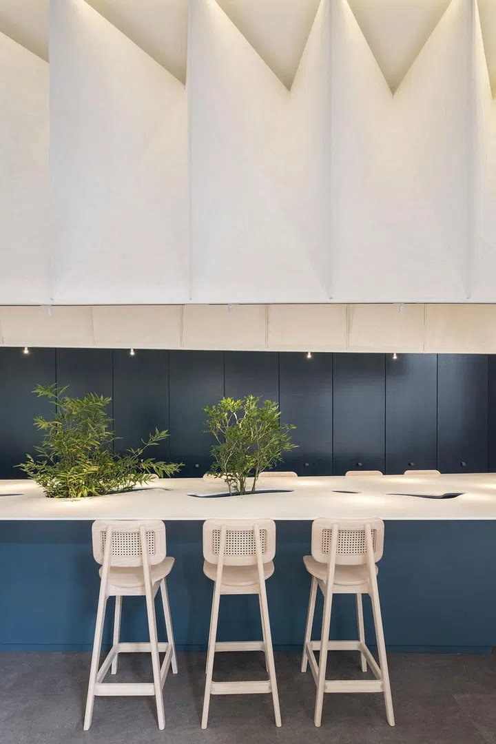 Inspired by the hashigakari or the bridge-like section connecting the main Japanese Noh stage, it sits at a carefully calibrated height – 2m above the floor – so that it doesn’t obstruct the view but compels diners to duck while they are taking their seats, as if they were entering the stage. “They are invited to participate in the spectacle initiated by Kenneth and Delphine,” shares Produce’s design director Pan Yicheng.