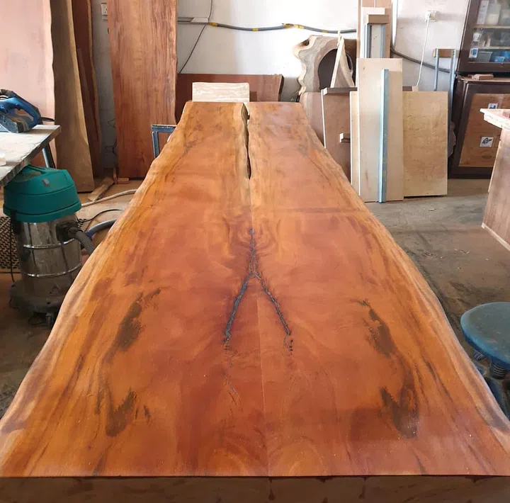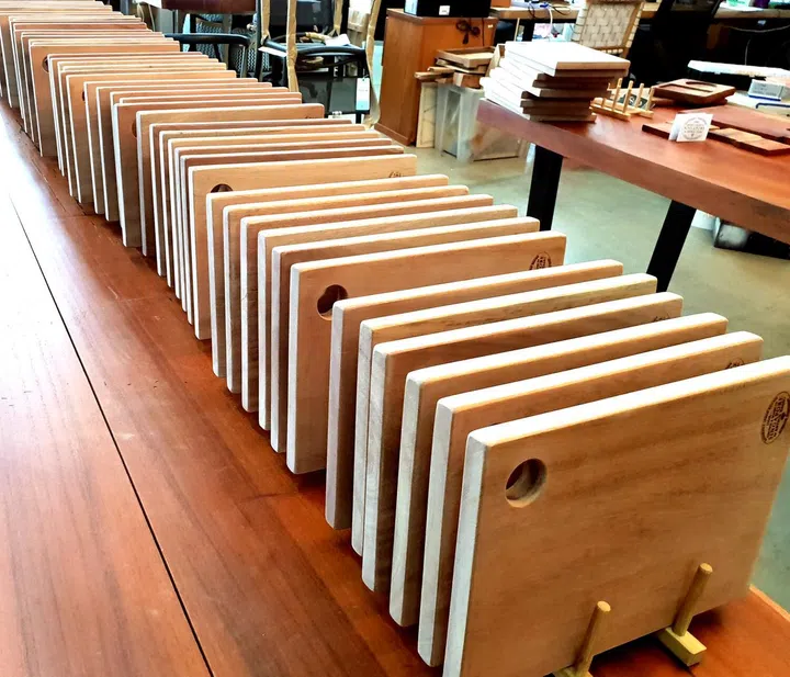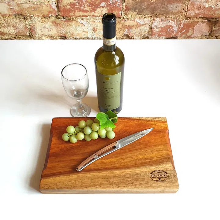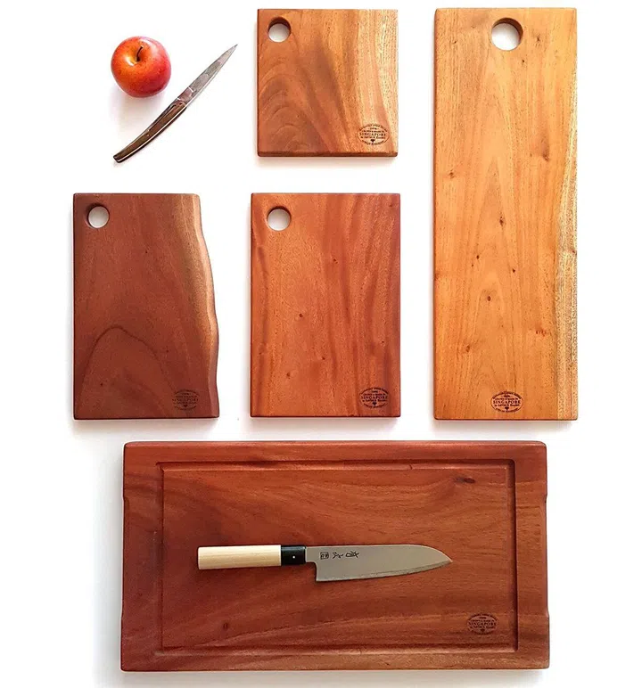 Our Sustainable Singapore Wood cutting boards! Everyone can enjoy them, regardless of the size of their flat. On the other end of the spectrum, I am very proud of some of our large Singapore rain tree and Singapore African mahogany dining tables. Also, the complicated book match joinery, epoxy resin work and the hand-sanded and -finished one-of-a-kind art pieces.