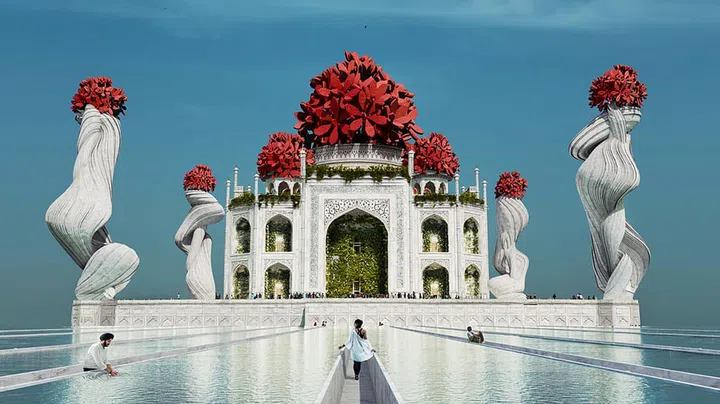"We redesigned the iconic pillars in the style of India’s famous trail tree trunks, while sitting on top of the pillars are jungle geranium or Ixora Coccinea. Hanging plants appear on the walls behind the front-facing arches and window frames, and in place of the famous reflecting pool in front of the Taj Mahal, we created an extensive network of water bridges to reflect the importance of water in Indian cultures."
