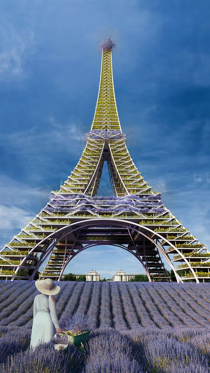 "We kept the redesign simple by lining the grounds with lavender, the traditional flower of the French countryside. As you move up the tower, we placed shelves containing bunches upon bunches of sunflowers - France's second most loved flower! Lavender also coats the staircase as well as the observation decks and the very top of the tower, producing a beautiful, purple floral statement."