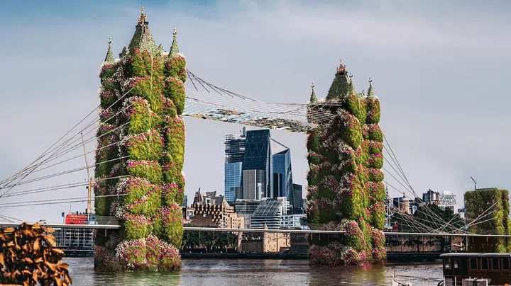 "We redesigned this iconic bridge with bushes covering the towers which are closely tied with Britain’s historical association with grand manor houses and their perfectly kept gardens. Neatly encased in each crevice are flowers inspired by our own lovely flower bouquets that include freesias, snapdragons, lisianthus, and meadowy foliage."