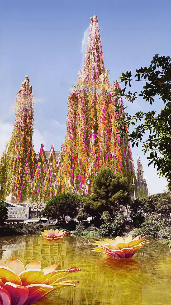 "We’ve redesigned the landmark in a biophilic way by creating a base layer of Mediterranean hanging plants like geraniums and durantas encasing the church. We then lined the body of the church with diamond-shaped mirrors decorated with shards of red, orange and pink, resembling the native flowers of Spain like Lantanas, Gazania, and Bougainvillea. Water sprays from the tops of the spires, splitting the light rays into beautiful rainbows. At the base of the church, we've placed mirror flowers in the ponds for more exotic beauty and colour."