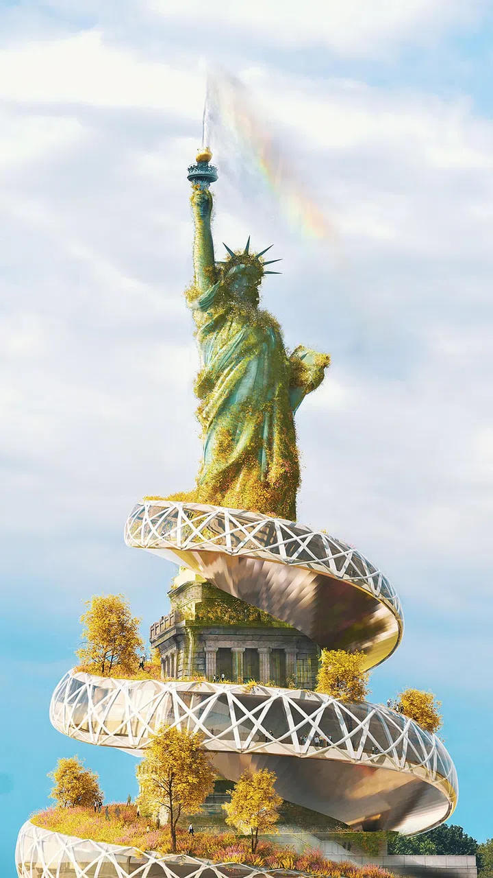 "In our redesign, we covered the statue in moss to changes with the seasons as the rest of the great American countryside does. We added Sequoia and Birch trees, along with some grassy areas to represent both the iconic Manhattan spring/fall seasons and to connect the statue to America’s vast network of forests and famous national parks."