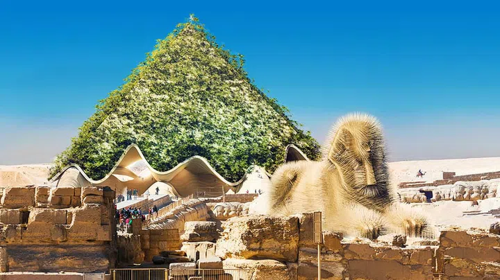 "As you can see we covered the existing pyramid shape with lush greenery. The sand dune reflected in the wave structure at the base of the pyramid was inspired by architect Chad Oppenheim’s interpretation of the landscape. Finally, we also rebuilt the most natural object of the land, the Sphinx, by restoring the animal to its former glory and placing thousands of fine branches to give it an ostensibly furry finish."