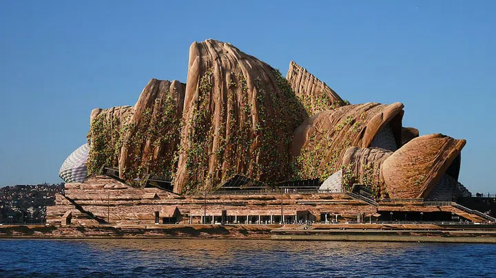 "Drawing inspiration from Australia's iconic landscapes, we transformed the opera house into a structure to represent the distinctively different facets of the countryside. The classic shells have been redesigned to resemble Uluru, or Ayers Rock, with the dome-like exteriors taking inspiration from the Great Barrier Reef. The shells are also coated in traditional Australian plants and flowers, like Eucalyptus and Banksia."