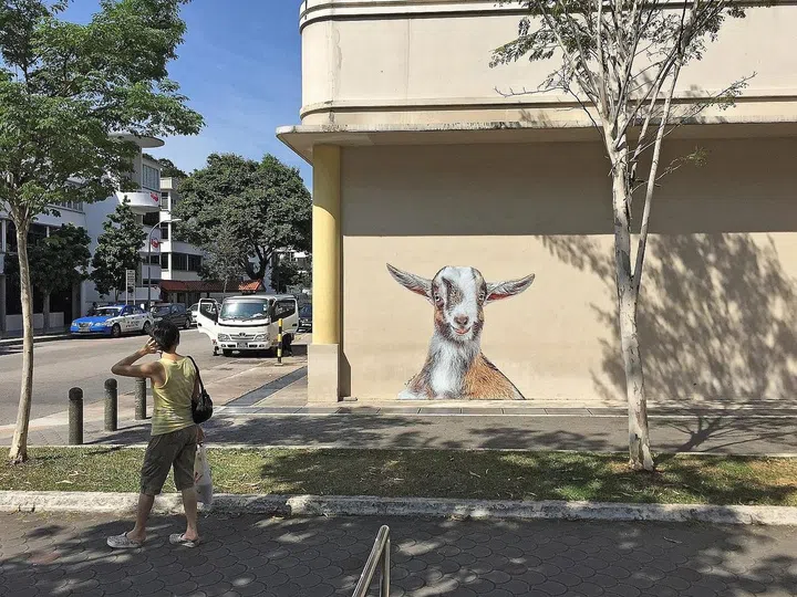 In 2014, artist Ernest Goh created three murals at the Tiong Bahru Market for the Chinese Year of the Goat. These billy goat paintings continue his animal-inspired series, which he started in the neighbourhood in 2013.