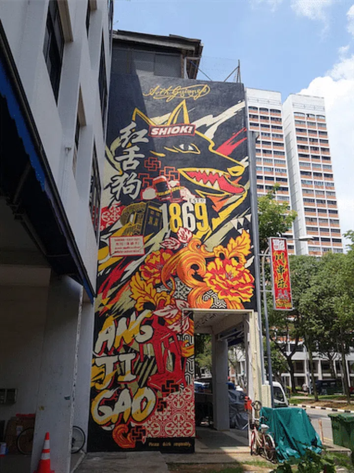 The mural also has the words "Ang Ji Gao", meaning "red-tongued dog" in Hokkien, a common term local Chinese men use to refer to the beverage. Qwek also designed the special-edition bottles and cans along a similar theme.